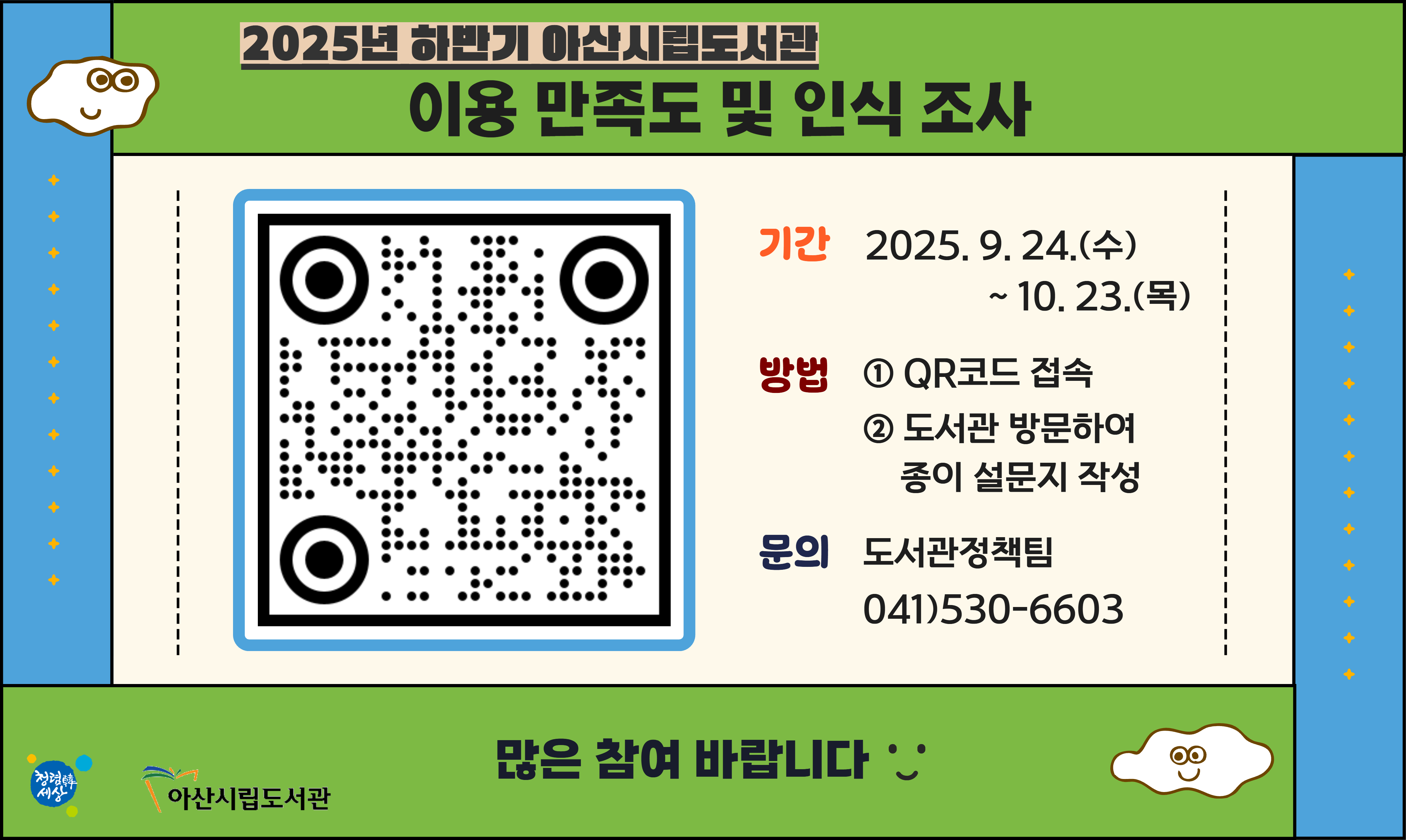 설문은 △도서관 서비스별 만족도 △도서관의 사회적 영향 인식 등 총 5항목으로 구성되며, 온라인(QR코드 접속)과 오프라인(아산시립도서관 7개관 내 비치된 종이 설문지 제출)으로 참여할 수 있다.