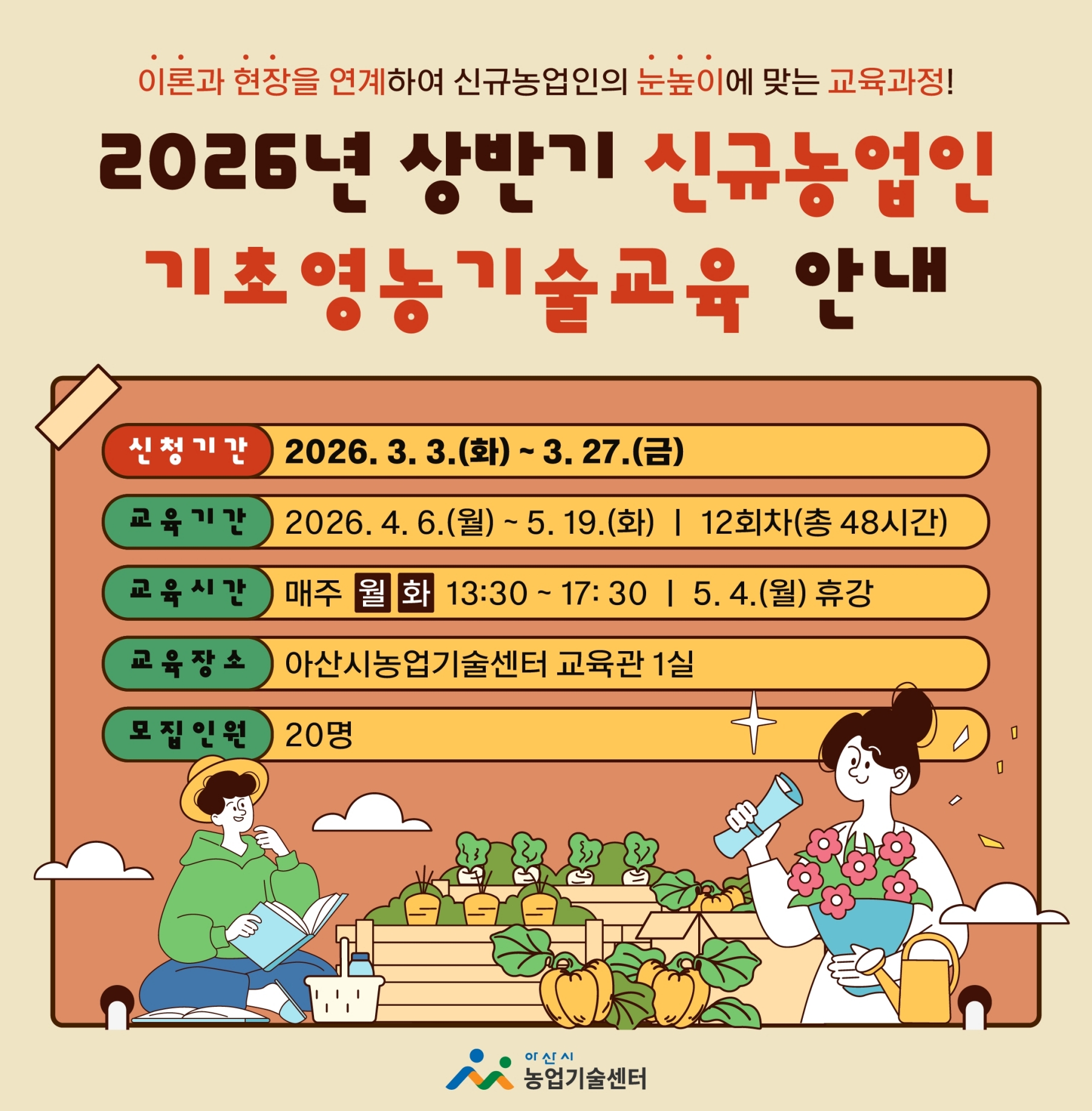 교육은 2026년 4월 6일부터 5월 19일까지 매주 월·화요일 총 12회, 48시간 과정으로 아산시농업기술센터 교육관과 농업 현장에서 진행된다.