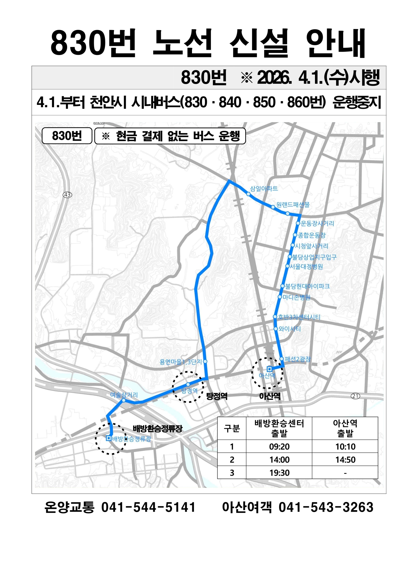 △ 830번: 배방환승정류장-탕정역-삼일원앙아파트-천안시청앞사거리-아산역(왕복 2.5회 운행)